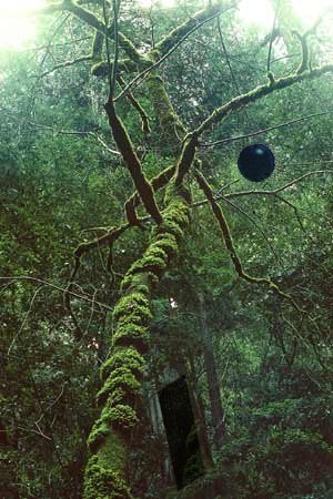 When we'd got to the bottom of the hill, I parked the car. I told Jenn to wait while I checked things out. I got the urge to proceed into the gap between the two rows of trees. Immediately as I passed the row of pines I felt a presence to my left. I looked there, and saw a shiny black sphere approximately 6 feet in diameter hovering in the air. It said, "PEOPLE!! What are you doing here?"
