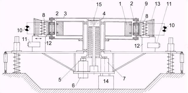 The stator 1 was mounted motionlessly, and the rollers 2 were assembled on a mobile common separator 3, connected with the basic shaft 4 of the device. Through this shaft the rotary moment was transferred. The basic shaft by the means of friction muff 5 was connected to the electrodynamics generator 7 and starting engine 6, which accelerated the converter up to a mode of self-sustained rotation. Along a rotor the electromagnetic inductors 8 with open cores 9 were located. The magnetic rollers 2 crossed the open cores of inductors and closed the magnetic flux through electromagnetic inductors 8, and induced emf in them, which acted directly on an active load 10 (a set of incandescent lamps with total power 1 kW). The electromagnetic inductors 8 were equipped with an electrical drive 11 and had an opportunity to smoothly move on supports 12. To study the influence of the external high voltage on the characteristics of the converter the system of radial electrical polarization was mounted. On periphery of the rotor ring electrodes 13 were set between the electromagnetic inductors 8 having with the rollers 2 air gap of 10 mm. The electrodes are connected to a high-voltage source; the positive potential was connected to the stator, and the negative to the polarization electrodes. The voltage was adjusted in a range of 0-20 kV. In experiments the constant value of 20 kV was used. In case of emergency braking, friction disk from the ordinary car braking system was mounted on a basic shaft of the rotor. The electrodynamics generator 7 was connected to active load through a set of switches ensuring step connection of the load from 1 kW to 10 kW. The converter under going testing had in its inner structure the oil friction generator of thermal energy 15, intended for taping a superfluous power (more than 10 kW) into the thermo-exchange contour. But since the real output power of the converter in experiment has not exceeded 7 kW, the oil friction thermal generator was not used. The complete stabilization of revolutions of the rotor was carried out by electromagnetic inductors connected to an additional load, which was set of incandescent lamps with total power 1 kW.